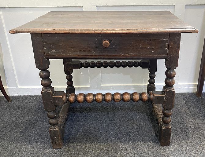 An 18th century oak rectangular side table with single drawer, on block and turned supports and stretchers, 77cm