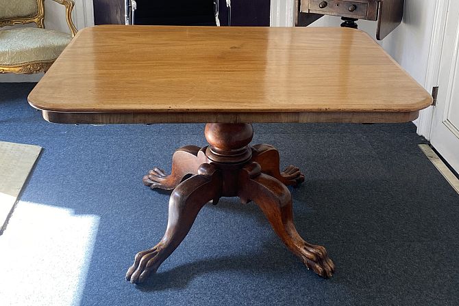 A Victorian mahogany breakfast table, the hinged rectangular top with rounded corners, raised on a solid baluster turned pedestal and four outswept lions paw supports, 123cm by 99cm.