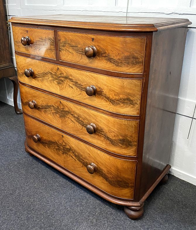 A Victorian mahogany bowfront chest of two short over three long drawers, with flame figured drawer fronts and knob handles, on turned feet, 110cm