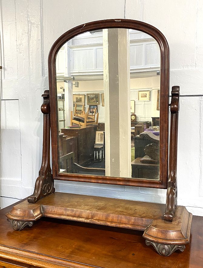 A Victorian dressing table mirror with adjustable arched frame, on scroll supports and platform base, 69cm