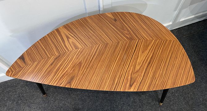 An Ikea LÖVBACKEN side table with veneered 'leaf' shaped top on three tapered legs with brass feet width 76cm, height 53cm, see Sarah Young's Independent article '£45 Ikea table could be worth thousands of pounds by 2040'