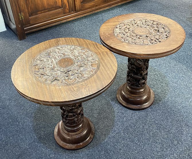 A pair of African tribal art carved hardwood side tables, believed to be from c.1960's Malawi, each of circular form with figurative carved tops, raised on figurative carved cylindrical columns and turned spreading bases, 48cm and 46cm diam by 50cm and 51cm high.