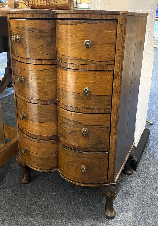 A vintage diminutive shaped front chest of drawers, being of small proportions and having four shaped front rosewood drawers with attractive cast brass handles, walnut top and sides, raised on cabriole legs, c.1920's, 42cm wide by 73cm high by 36cm deep.