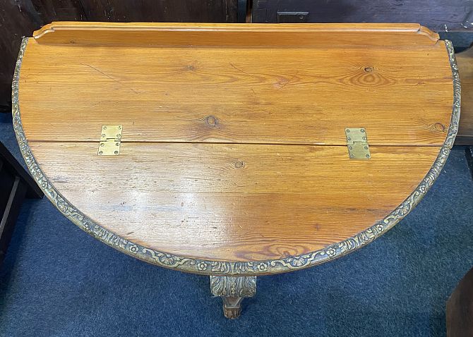 A stripped pine semi circular side table with coloured relief moulded decoration, the low raised back above a hinged top enclosing storage space, raised on three acanthus scrolled supports and decorative stretcher, 94cm wide by 50cm deep.