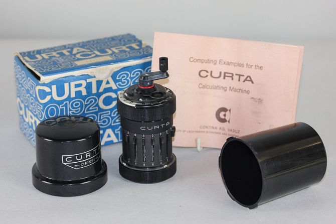 A Curta calculating machine made by Contina A.G. Vaduz in original box 'tube' holder and box with instructions