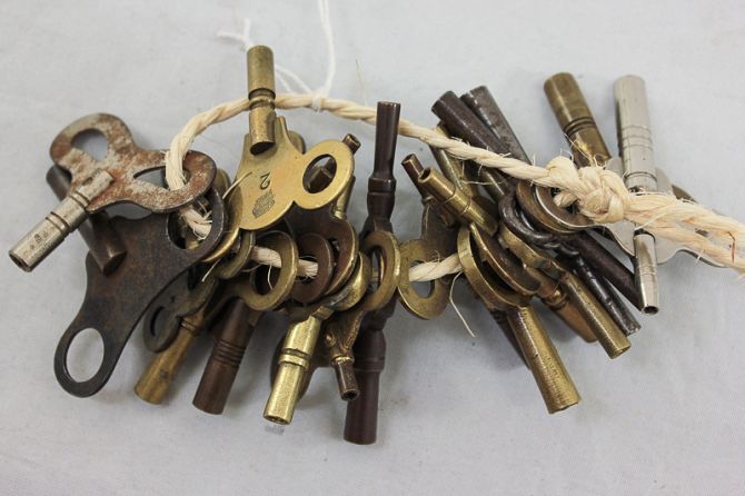 Twelve double-ended clock keys (winder and hand adjusters) for carriage/mantel clocks and six mantel clock keys