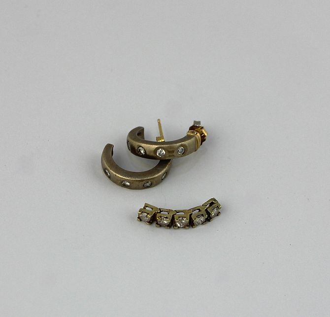 A pair of diamond earrings each in a curved design mounted with four circular cut diamonds, the tops with gold posts and butterfly fittings, along with a gold section of bracelet mounted with a row of five circular cut diamonds