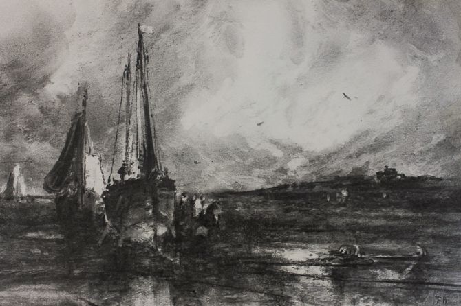 Attributed to Frank Brangwyn Beached boats, charcoal, bears initials, 32cm by 46cm