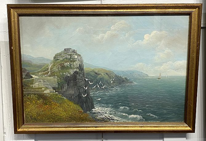 Richard Allam (19th century), 'Coastal landscape' with rocky coastline, seagulls and ships, oil on canvas, signed 'Allam', 34cm by 52cm, framed.