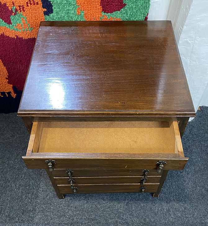 A diminuative vintage mahogany chest of drawers, c.1920's / 40's, the seven drawers with bronzed teardrop handles. raised on block supports, 56cm wide by 52cm deep by 71cm high.