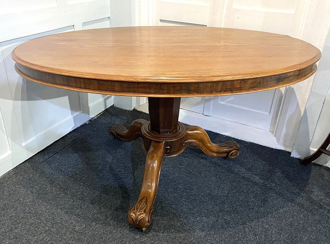 A Victorian walnut breakfast table, the oval hinged top with nicely moulded edges, raised on a tapered octagonal column and three foliate and scroll carved chunky outswept supports with wooden casters, 136cm by 97cm.