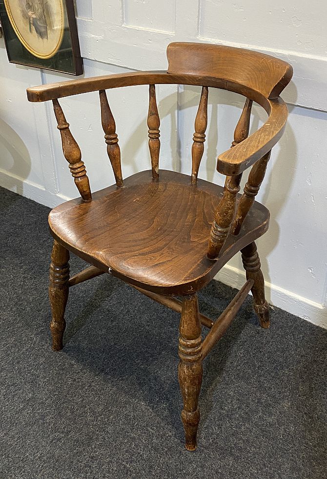 An early 20th century elm and beach Smokers bow armchair, of usual form, dished seat, horseshoe shaped back with turned supports, turned legs united by H stretcher.