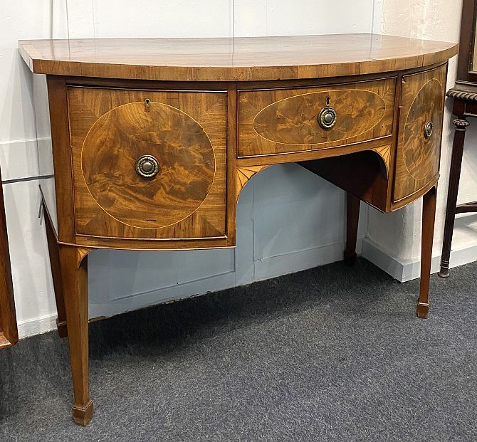 A Sheraton style crossbanded mahogany bowfront sideboard with central drawer flanked by two deeper drawers with panelled fronts, on square tapered legs and spade feet, 119cm