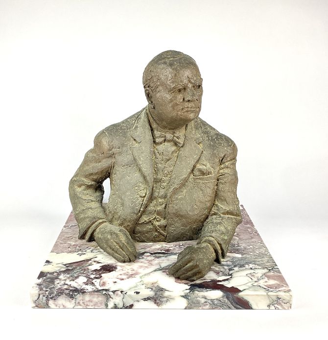 Kenneth Carter (1928 - 2007), a bronzed resin bust of Winston Churchill, signed and dated, on polished stone base, together with related paperwork on the artist and a book on his work at Exeter Cathedral 'The Testament Sculptures'