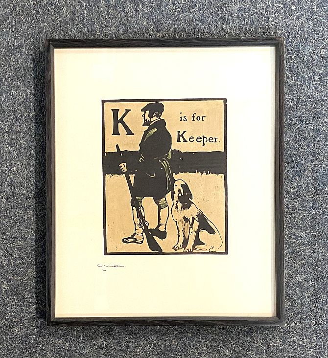 Sir William Nicholson (British, 1872 - 1949), 'K is for Keeper' from An Alphabet, handcoloured wood-cut, signed to lower left margin, framed, 42cm by 34.5cm
