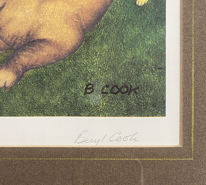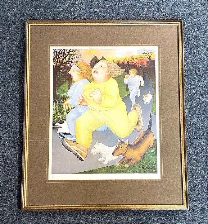 Beryl Cook (British, 1926 - 2008), 'Joggers on the Hoe' print, bearing Fine Art Guild blindstamp KCD, published by Alexander Gallery Publications Ltd., Bristol, England, signed in pencil lower right margin, framed and mounted, bearing framer label verso, 46cm by 37.5cm