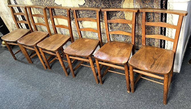 A set of six elm and beech chapel chairs, early / mid 20th century, most likely 'Essex double pilgrim ladderback' examples.