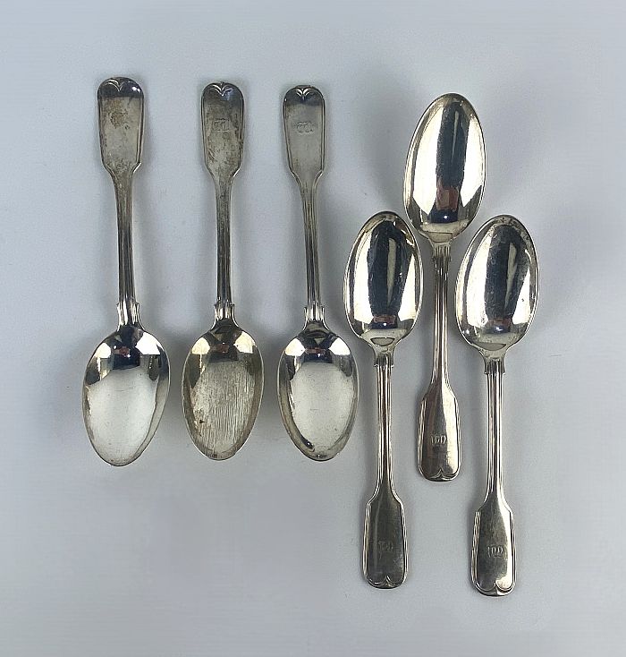 A set of six George IV Scottish silver Fiddle and Thread pattern spoons, by Mitchell & Sons, Glasgow, 1822, each with engraved monogram to handle, length 17cm, 8.7oz