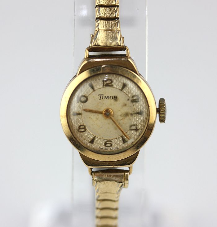A Timor 9ct gold cased lady’s wristwatch having a signed dial and lever movement, 1951 Chester hallmark, on a later sprung metal bracelet