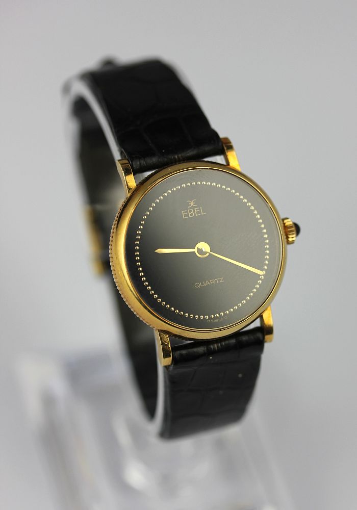 An Ebel quartz 18ct gold circular cased lady's wristwatch having a signed black dial, the case back detailed '18k 879008', fitted to a leather strap having a gilt metal buckle