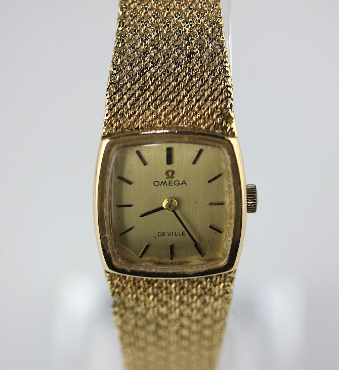 An Omega De Ville 9ct gold lady's bracelet wristwatch, the signed curved square gilt dial with baton hour markers, fitted to a tapered woven link bracelet with an Omega foldover clasp gross weight 33.4g