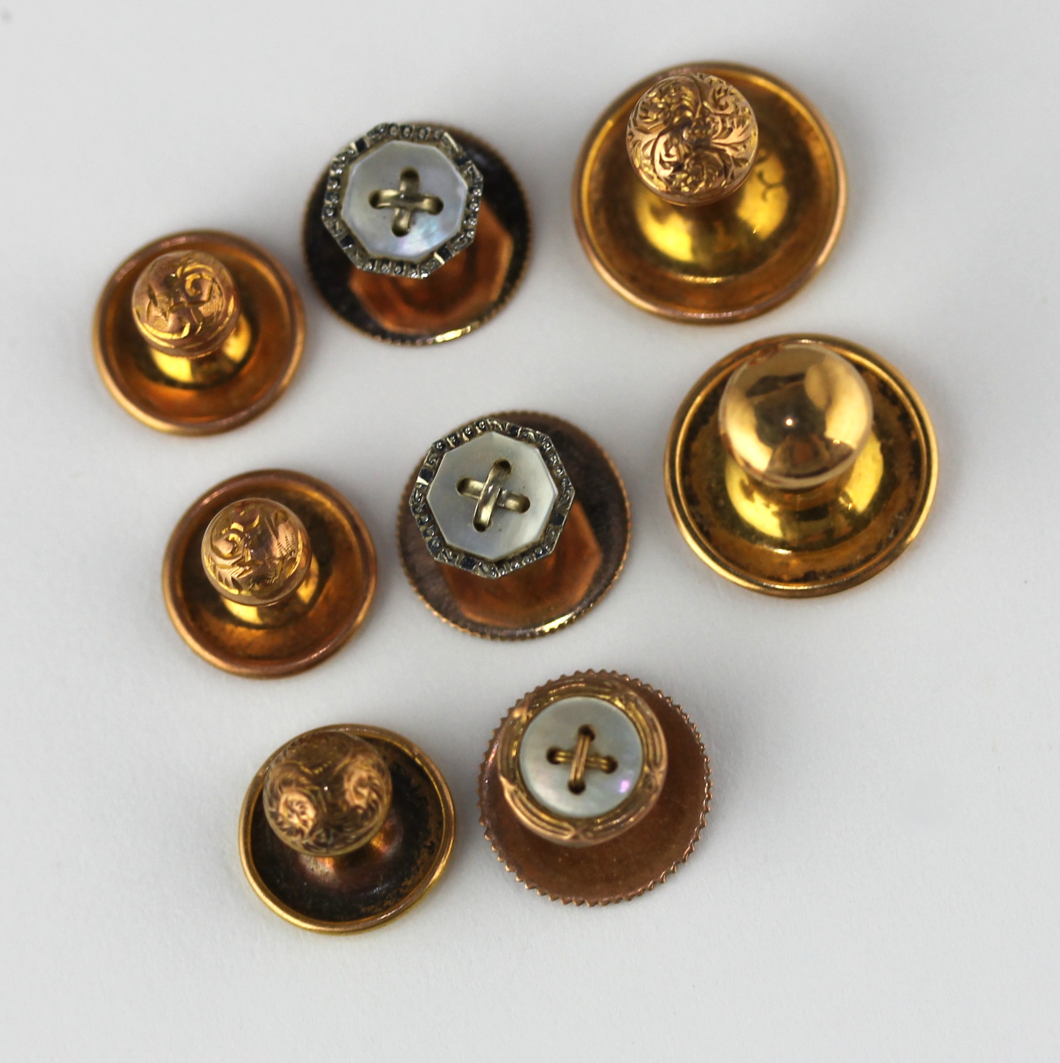 A pair of gold and mother of pearl dress studs detailed '18ct 9ct', one gold and mother of pearl detailed '9ct' and five further gold dress studs, combined gross weight 6.9g
