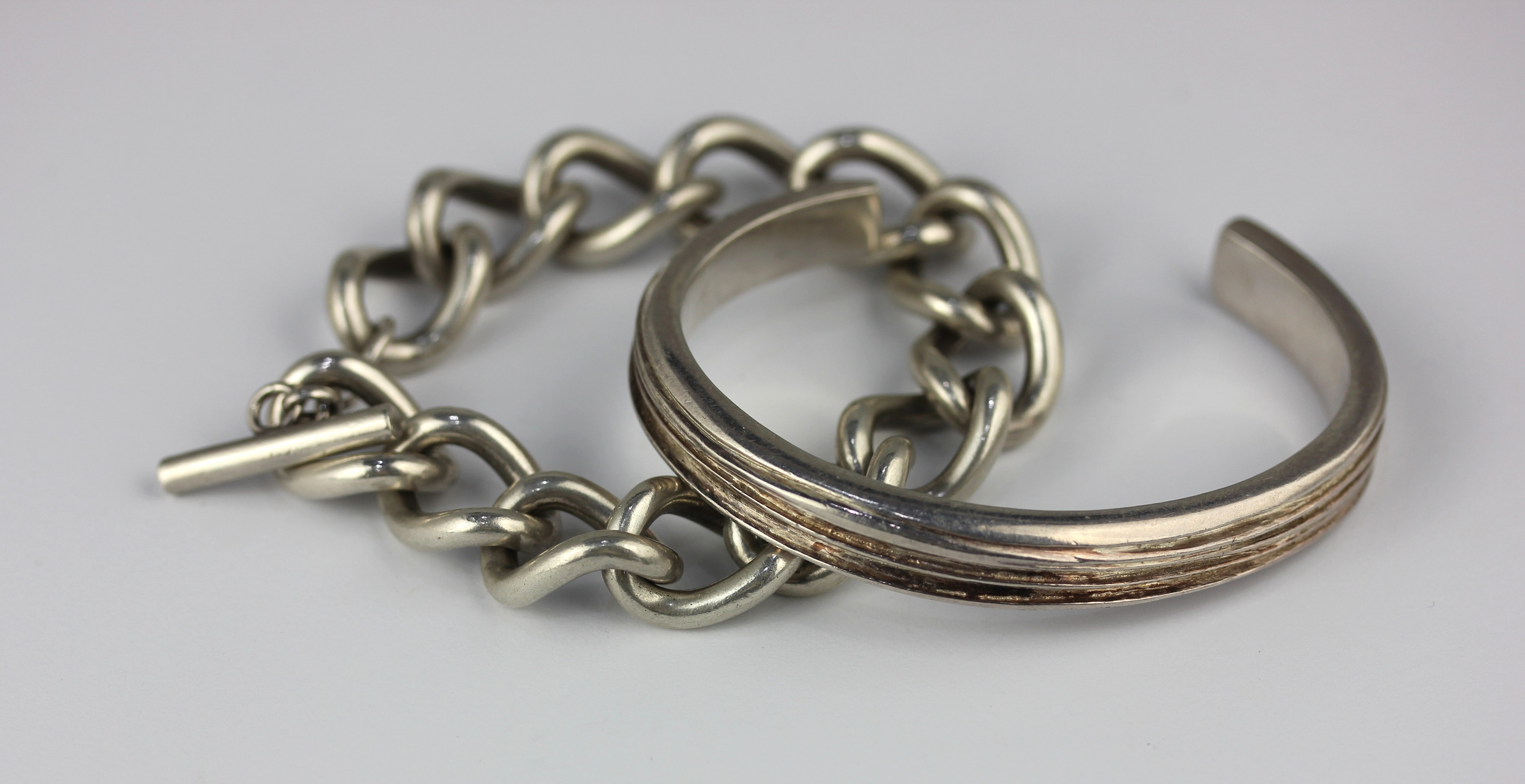 A silver curb link bracelet with a bar form clasp length 20cm and a Links London bangle combined weight 118g