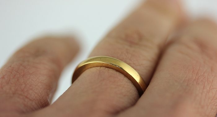 A gold wedding ring inscribed within the band with date 1947, detailed '18ct', ring size L 1/2, 4.1g