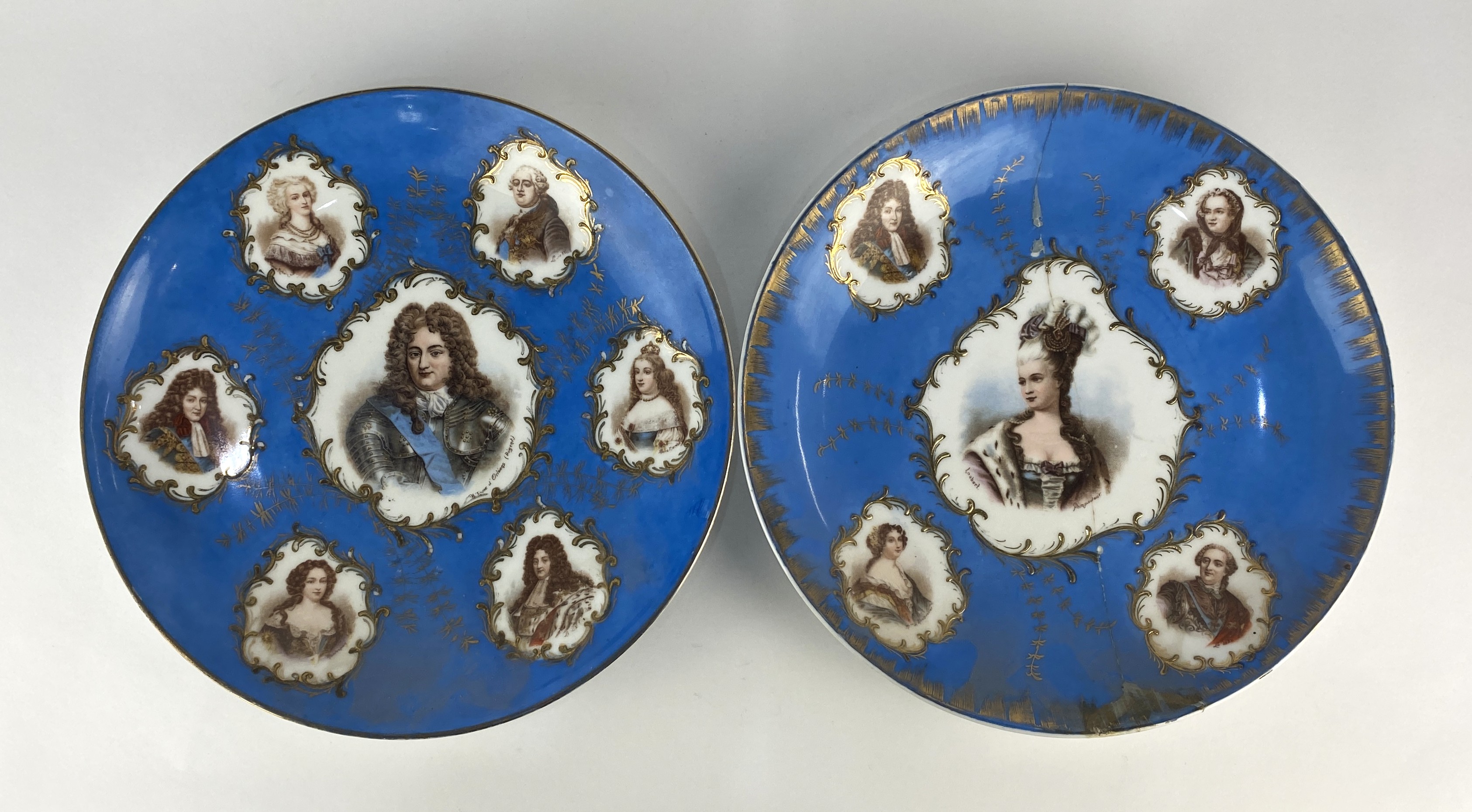 A pair of 19th century French porcelain portrait dishes, each of dished circular form decorated with various portraits within gilt borders on blue grounds, 29.5cm diameter, (one with old damage and rivet repair).