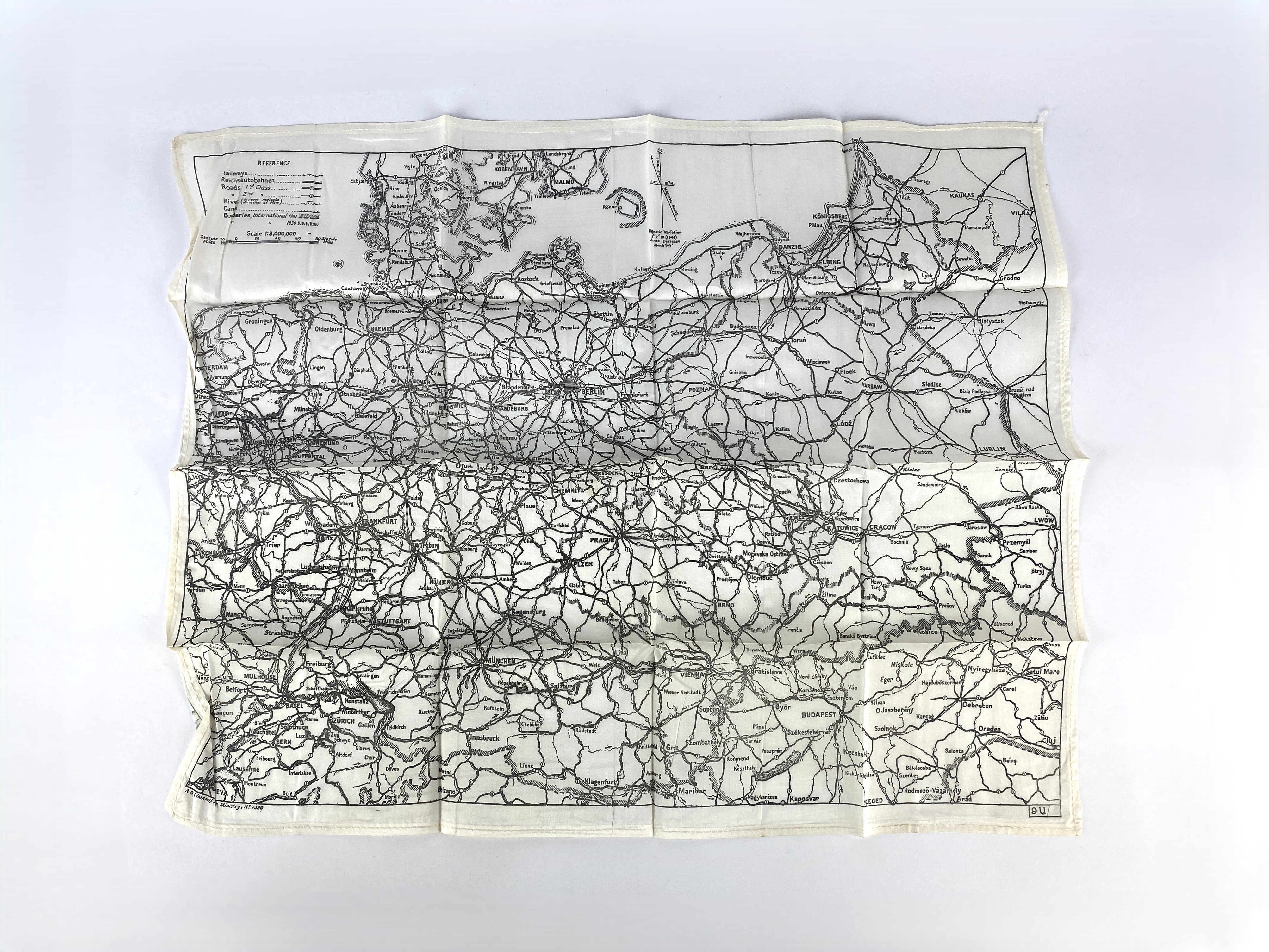 An RAF silk escape and evasion map, A.D.I. (MAPS) Air Ministry, No. 7330, 37cm by 46cm.