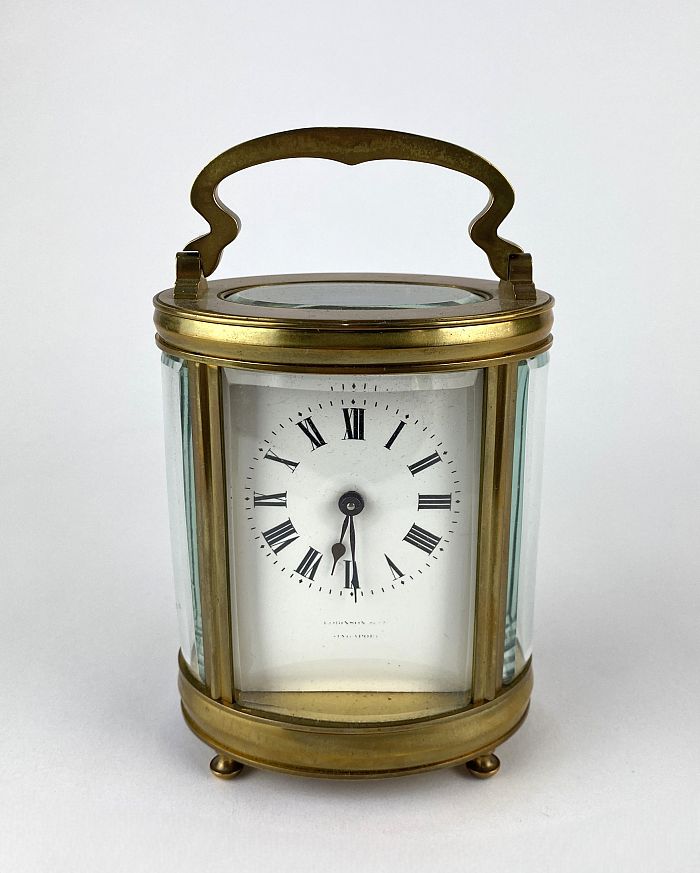 A French brass and bevelled glass oval cased carriage clock, the white enamel dial with Roman numerals and worn inscription, 16cm high, no key