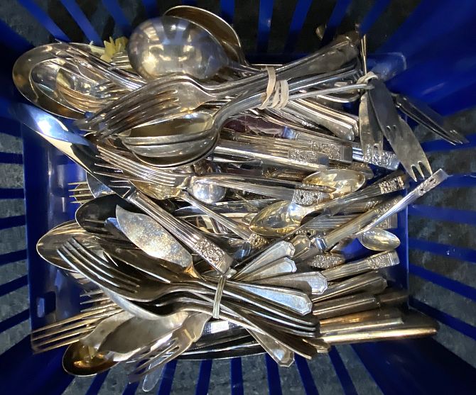 An early 20th century Georgian style walnut cutlery table, the serpentine hinged top enclosing a comprehensively fitted interior, with full length drawer enclosing further storage, raised on cabriole legs, 76cm wide by 78cm high by 55cm deep, together with a quantity of loose cutlery.