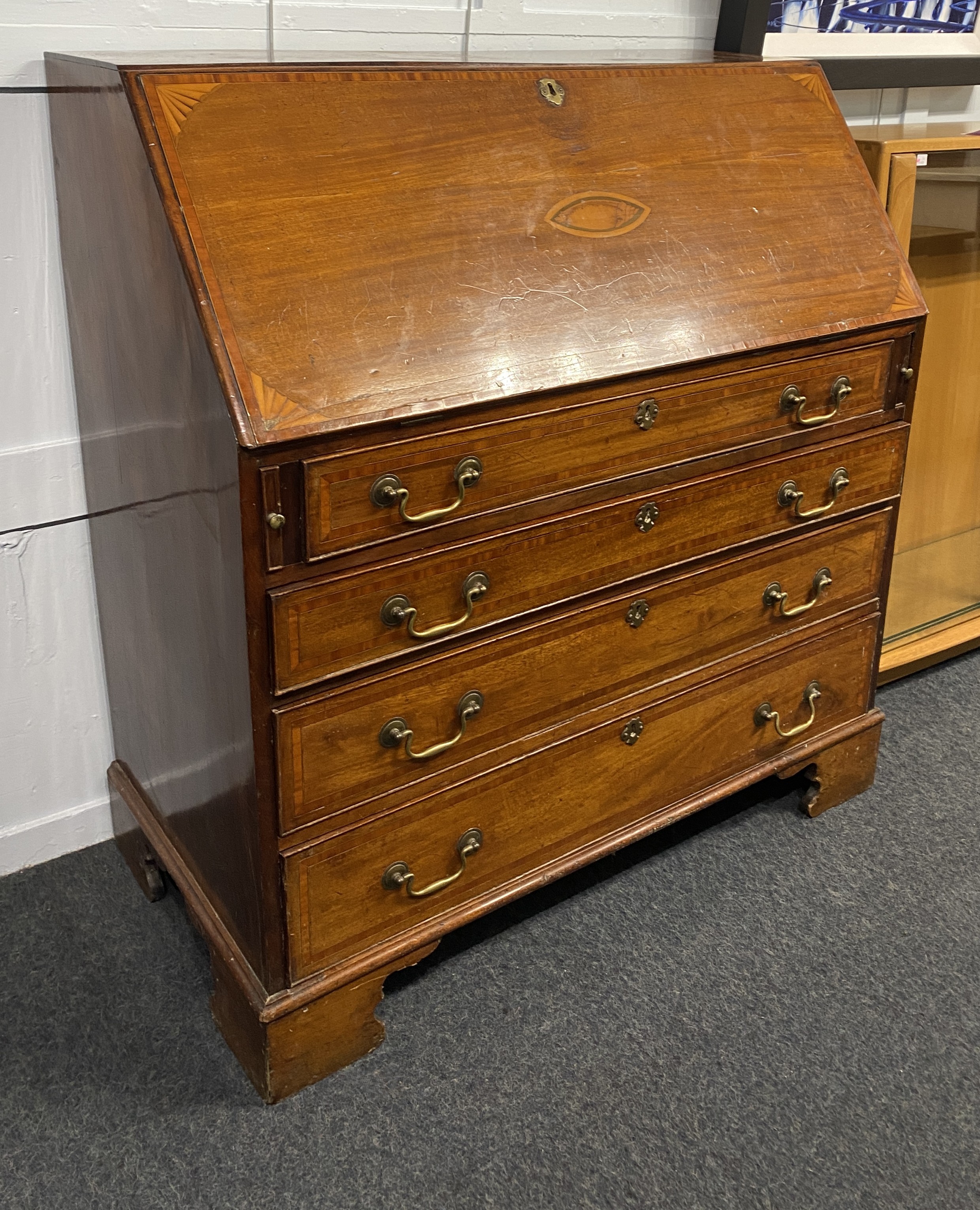 A George III marquetry inlaid and cross banded mahogany bureau / writing desk, the hinged sloping fall front enclosing an inlaid fitted interior, above four inlaid graduated long drawers with brass swan neck handles, raised on bracket feet, 106cm wide by 54cm deep by 112cm high, makes a great home office!