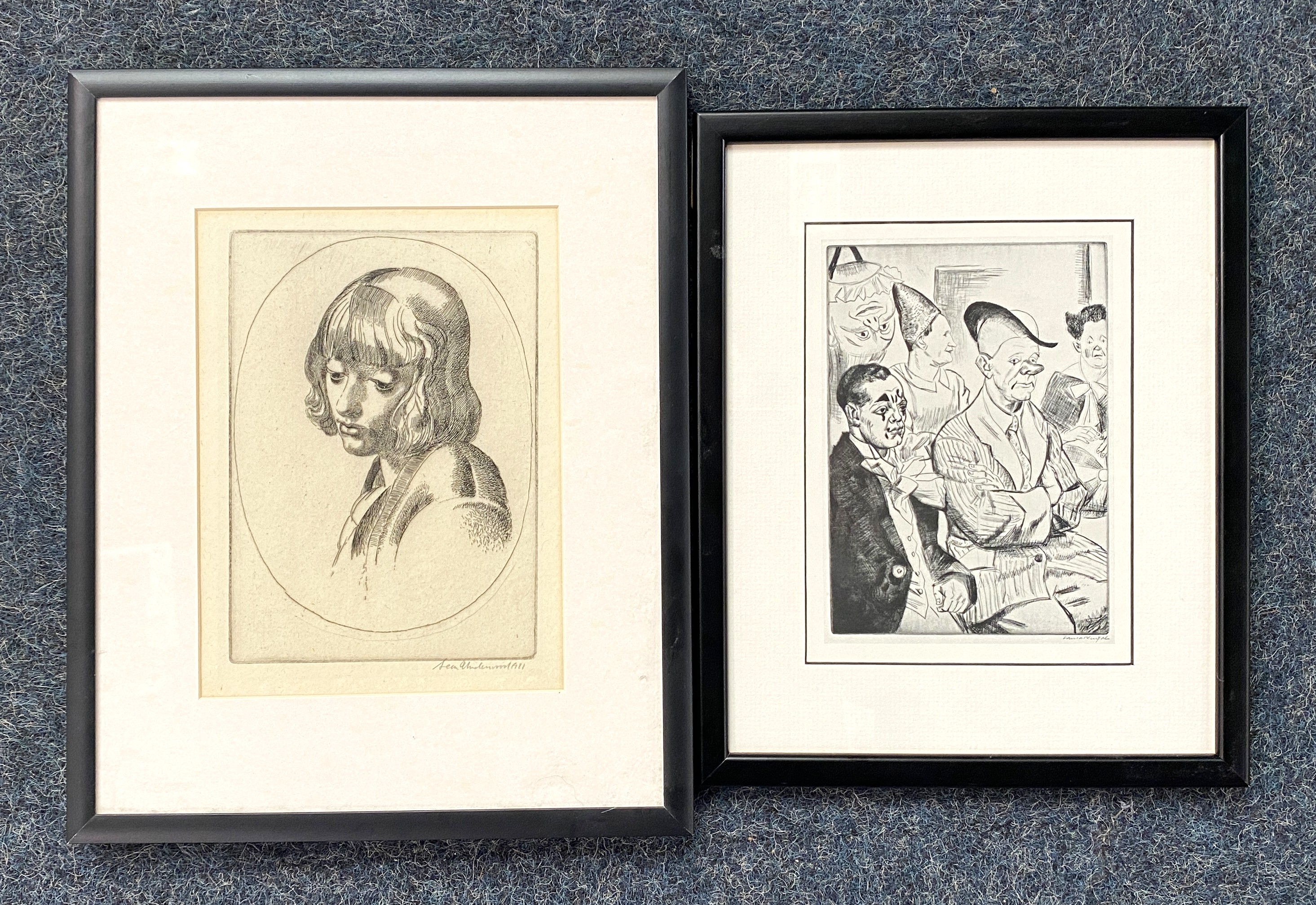 Leon Underwood (Captain George Claude Leon Underwood) (British, 1890 - 1975), 'The Tulip Girl', etching, signed and dated 1921 in pencil to lower right margin, framed, 19.5cm by 14.5cm, together with a reproduction print 'Some Clowns' by Dame Laura Knight, framed 16.5cm by 11.5cm (2)