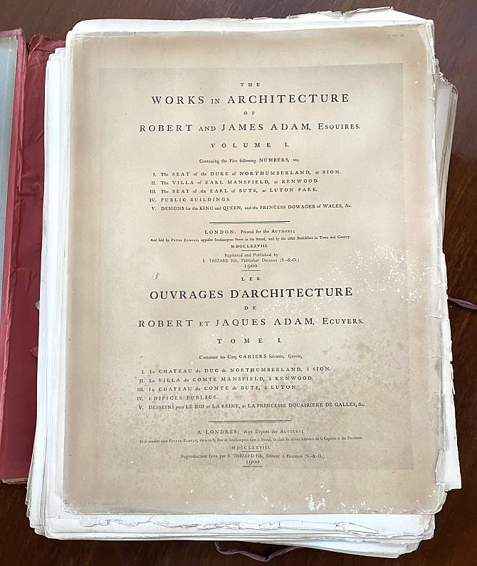 (Adam) Robert & James: The Works in Architecture of Robert Adam and James Adam, Volume 1, 1778 reprinted by E. Thezard Fils, 1901, limited edition number 315/500, containing numerous loose plates depicting plans and images of their work, within cloth folio cover, dated 1907, large folio, cover detached, tie fastening