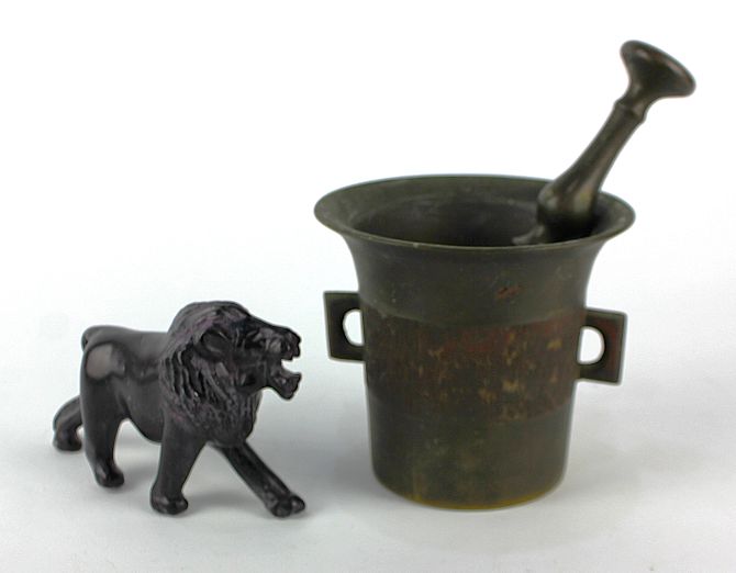 A bell shaped mortar with two handles, 11cm high, an associated pestle, and a small carved model of a roaring lion 9cm high