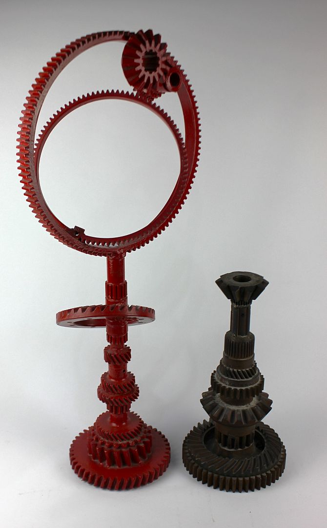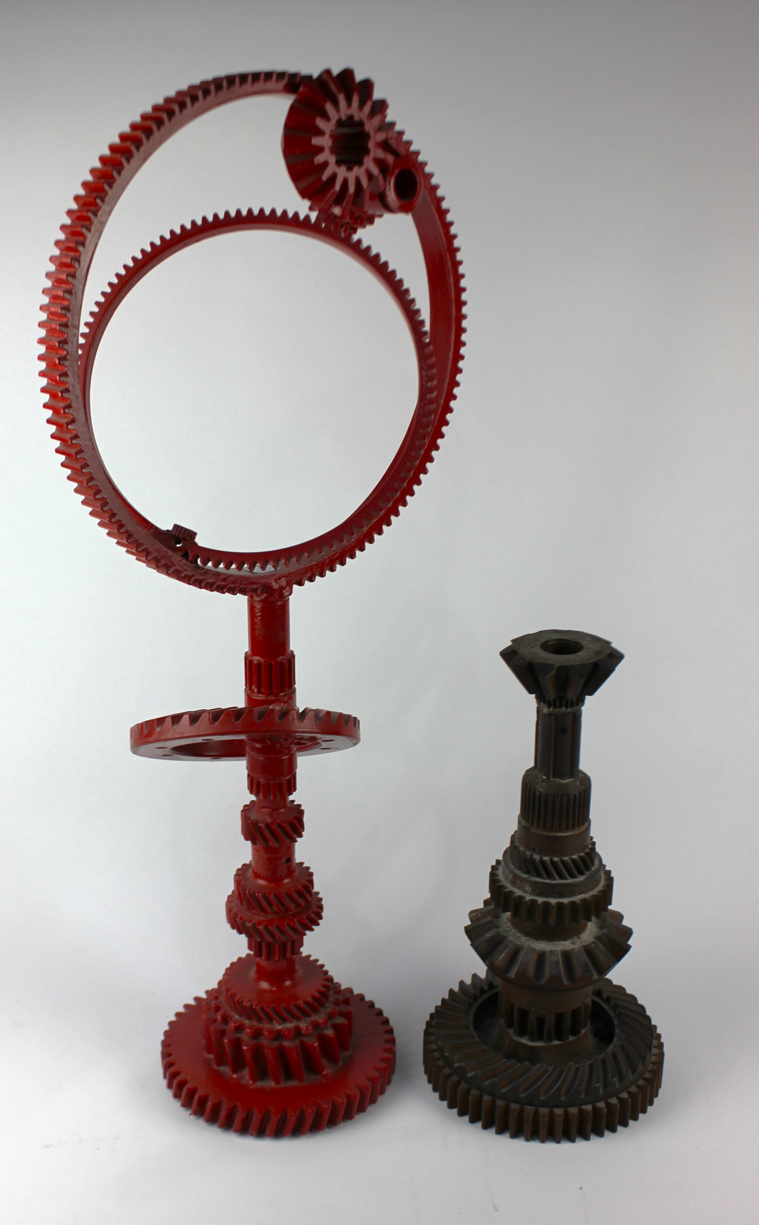 Modern Art: Two large abstract metal sculptures, using industrial forms, by Michael Scott (20th/ 21st century), one red painted, the largest height 76cm (2)