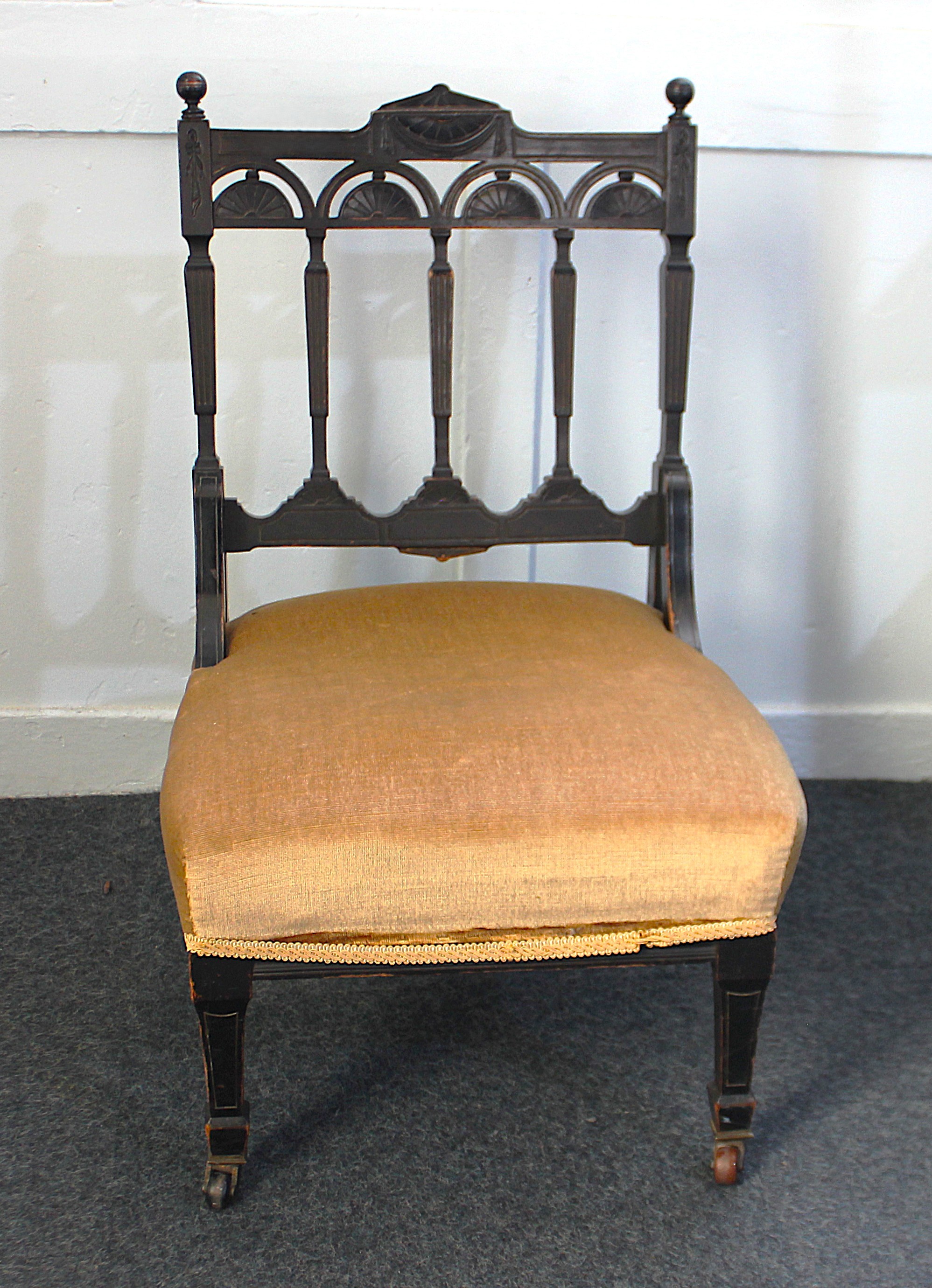 An Aesthetic Period ebonised low chair, c.1870, re-upholstered.