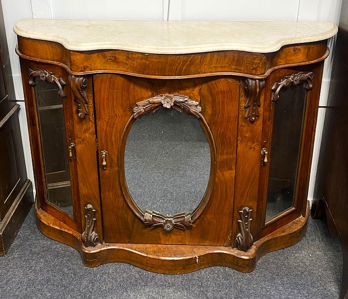 A Victorian marble topped walnut shaped front credenza, the three cupboard doors inset with mirrored panels, raised on a plinth base, 122cm wide by 86cm high by 37cm deep.