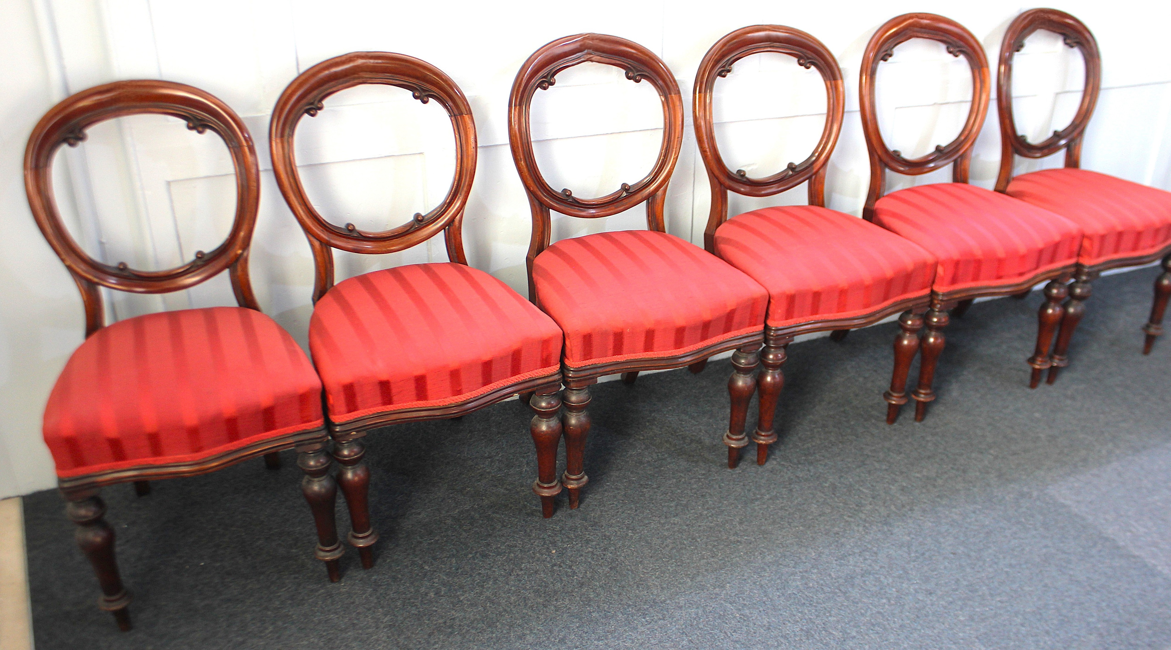 A set of six Victorian walnut dining chairs, of good solid construction, re-upholstered in a striped red fabric.