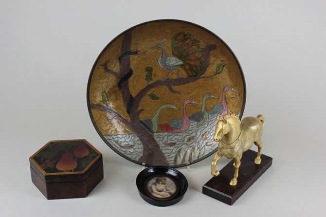 A wooden and brass case single draw telescope; a heavy metal gilt horse ornament; an octagonal lacquered box and other boxes and collectables, various