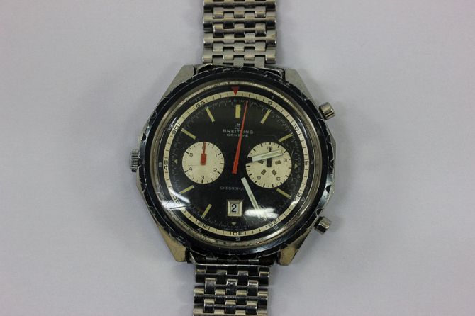 A steel Breitling watch, chronomatic model with black dial with white subsidiary dials on replacement bracelet