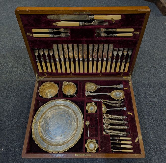 A cased silver plated dessert / fruit service for twelve with ivorine handles, comprising twelve pairs of knives and forks, serving knife and fork, pair of fruit spoons, sifter spoon, four nutcrackers (a/f), four nut picks, pair of salts (one spoon missing), milk jug, sugar bowl and serving dish