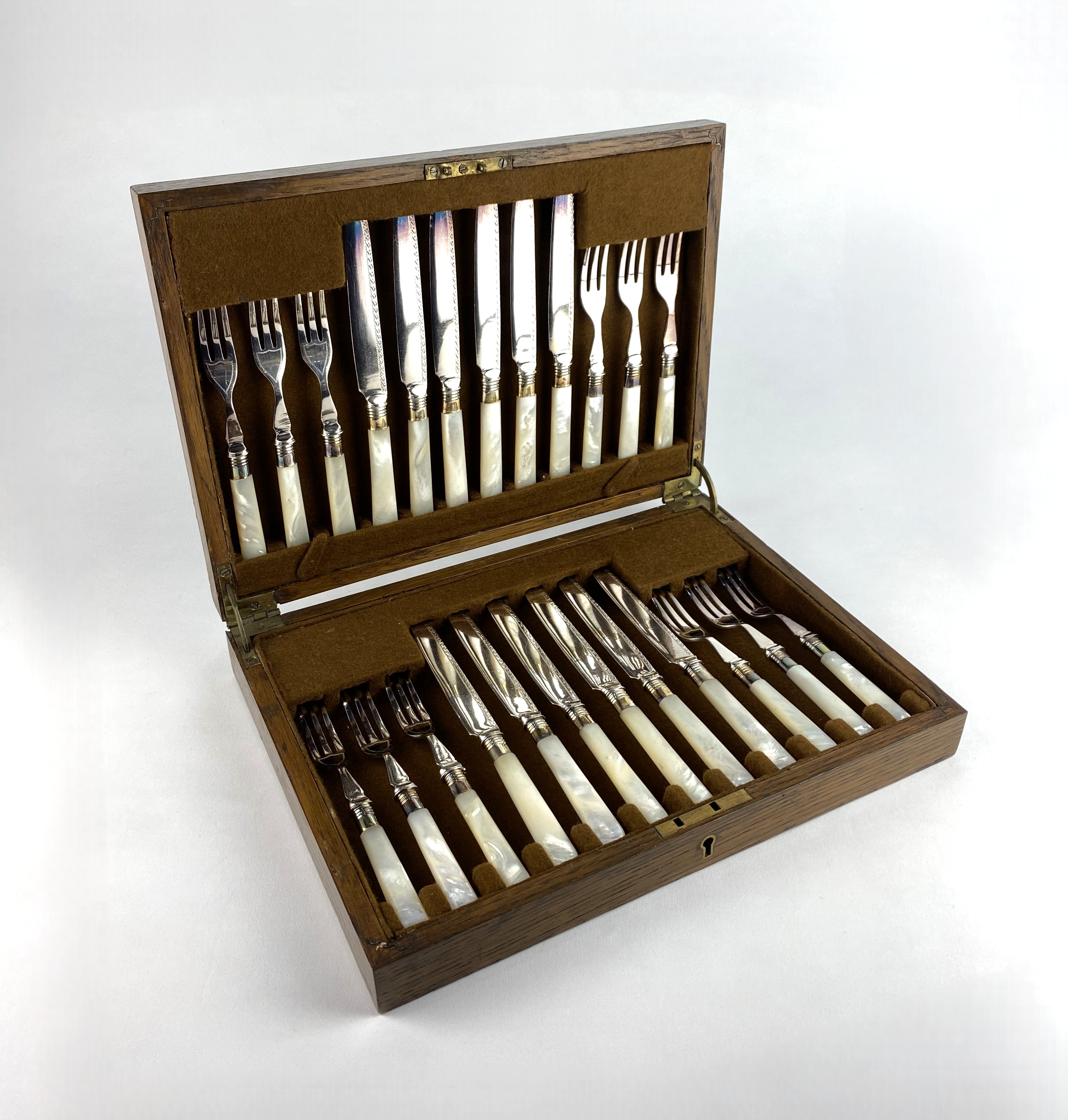 A cased set of twelve silver plated mother of pearl handled fruit knives and forks, by Mappin & Webb,within fitted oak box, case width 29cm