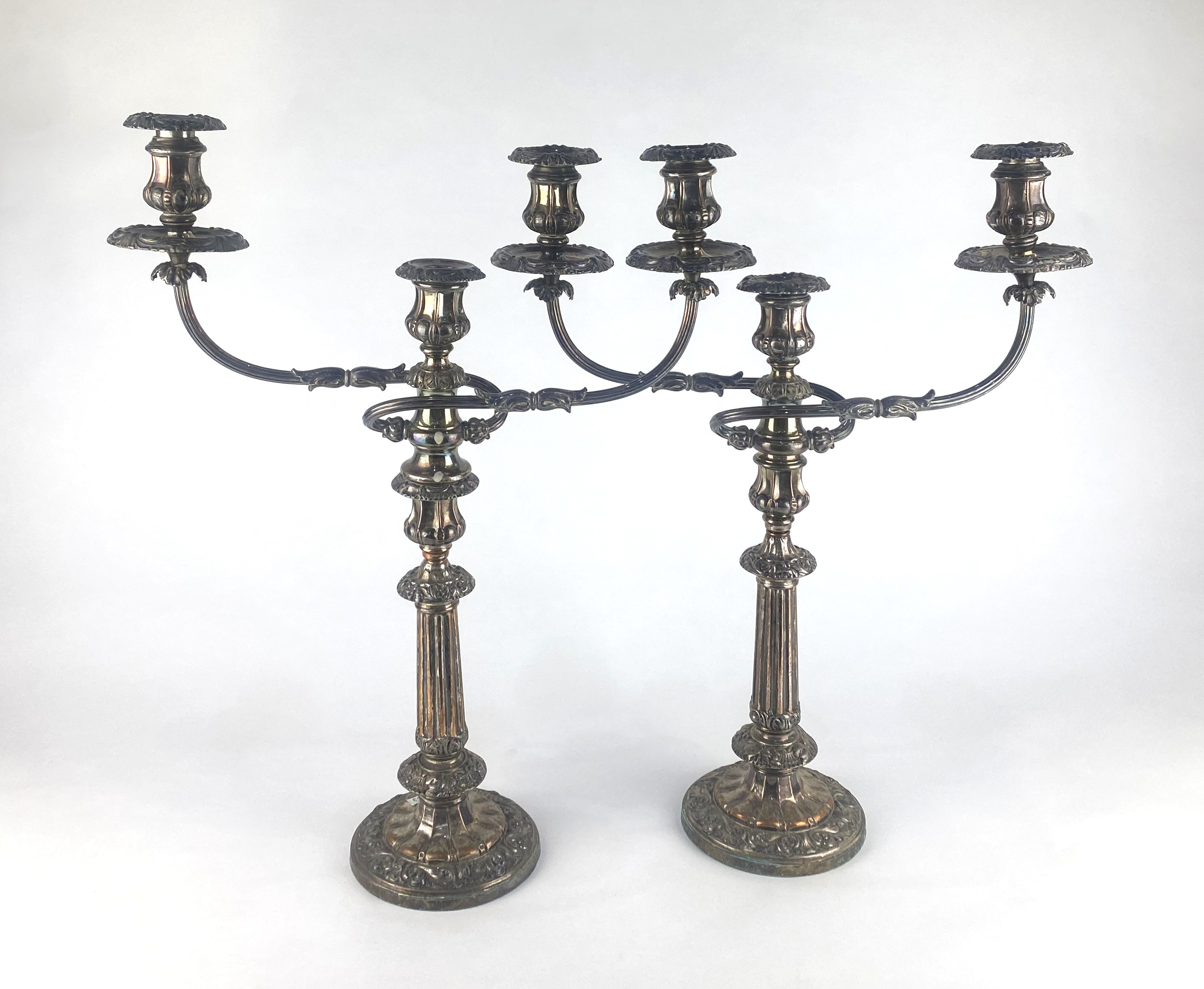 A pair of 19th century Old Sheffield Plate candelabra, each being three light with twin scroll branches on foliate cast and fluted column, 53cm high.