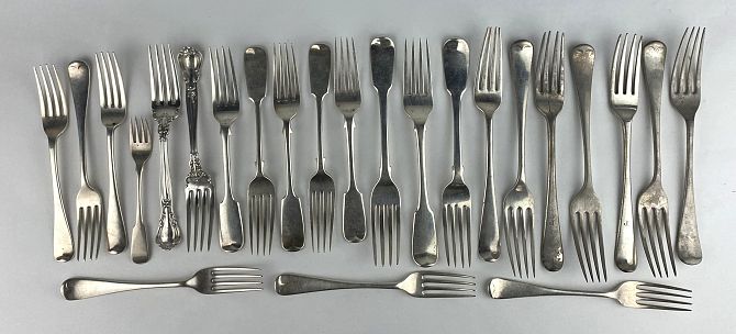 A collection of twenty four silver forks, mostly Georgian and Victorian, part sets and odds, combined weight 42.73 oz.