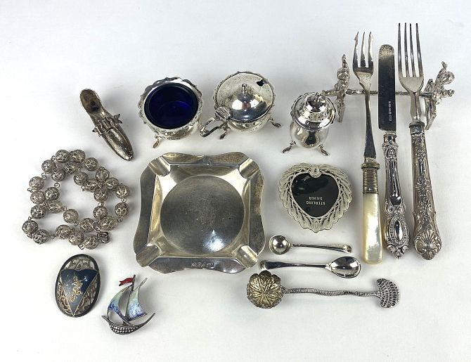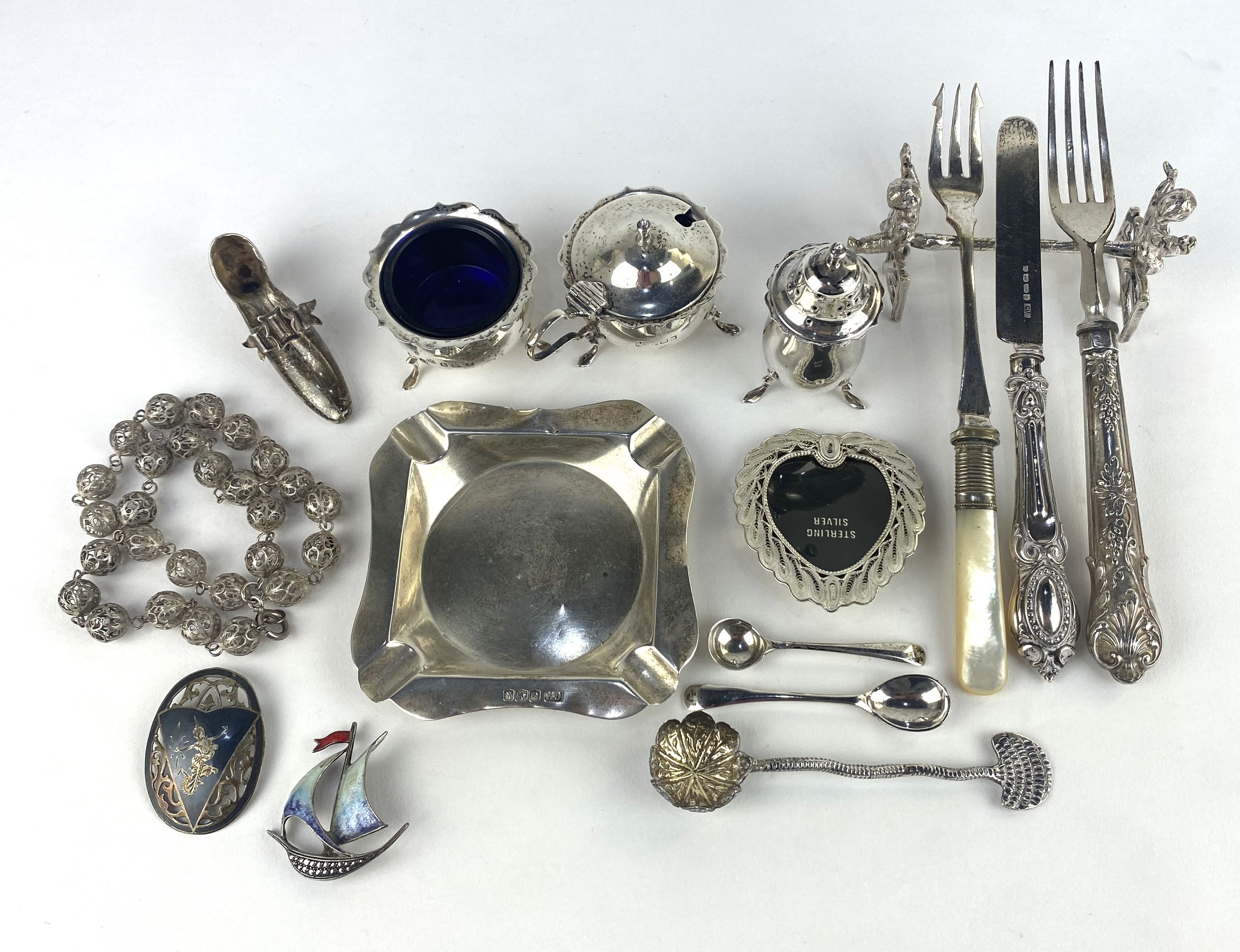 A silver niello oval brooch and a silver, enamel and marcasite brooch designed as a sailing boat, marked 925, together with a silver ashtray, a silver three piece cruet set, two silver condiment spoons and other items including a white metal model of a shoe, weighable silver 3.5oz