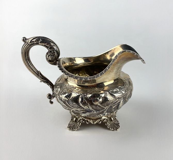 A William IV silver milk jug, maker George Frederick Pinnell, London 1832, monogram engraved, repousse decorated with scrolls and flowers, 10.5cm high, 6.5oz