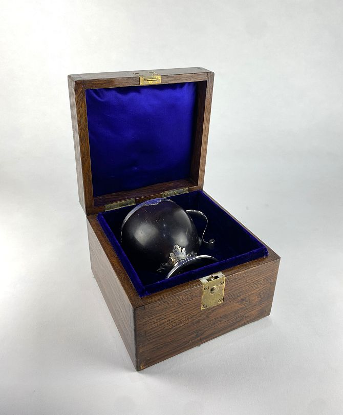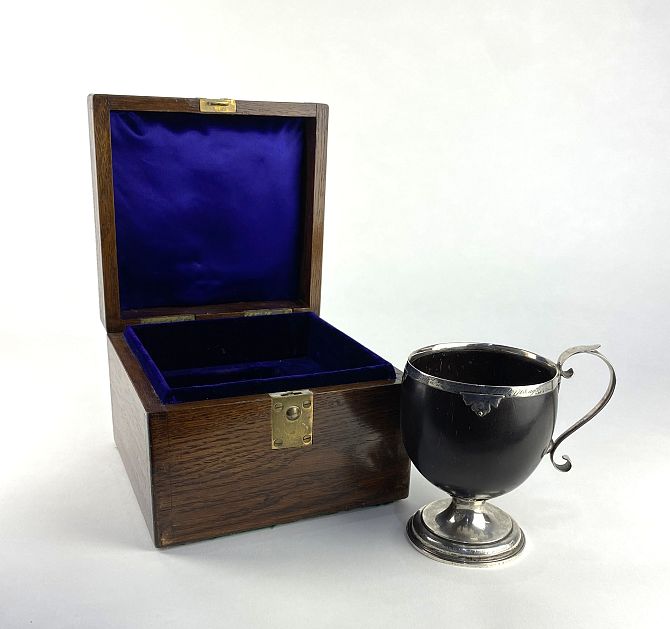An 18th century white metal mounted coconut cup, probably Scottish, inscribed to rim 'This cup is the property of John Garden Esq of Burghill by Brechin who died 19th April 1768, aged 63', further inscribed at base 'This cup on the demise of FG Mitchell presented to Jas Kirkwood by Miss I Poole on the 16th anniversary of HB Kirkwoods birthday presented by his Father to him', 14cm high, in a velvet lined oak case *For full details of provenance see extra photos