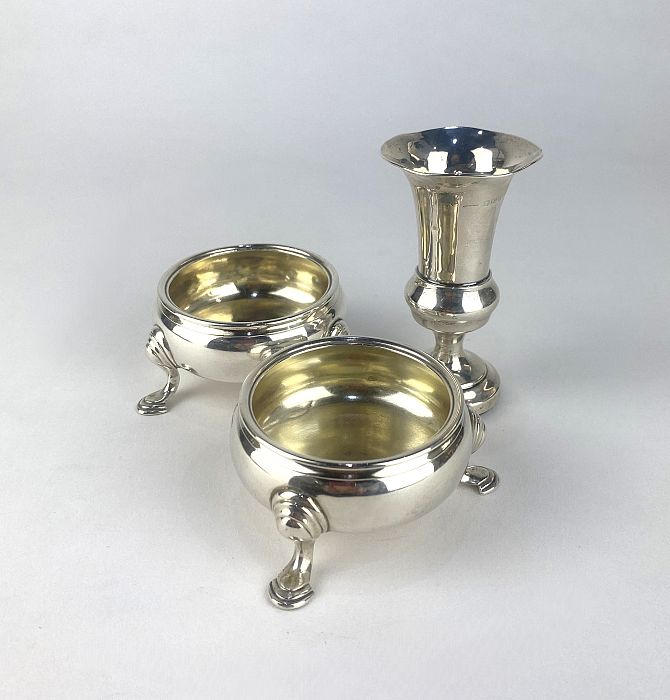 A pair of George II silver cauldron salts, by Edward Wood, London, 1743, each with reeded rim, raised on three hoofed feet, together with an Edwardian small silver vase, Birmingham, 1908, makers marks worn, of footed campana form, height 8.5cm, the salts 4.4oz (3)